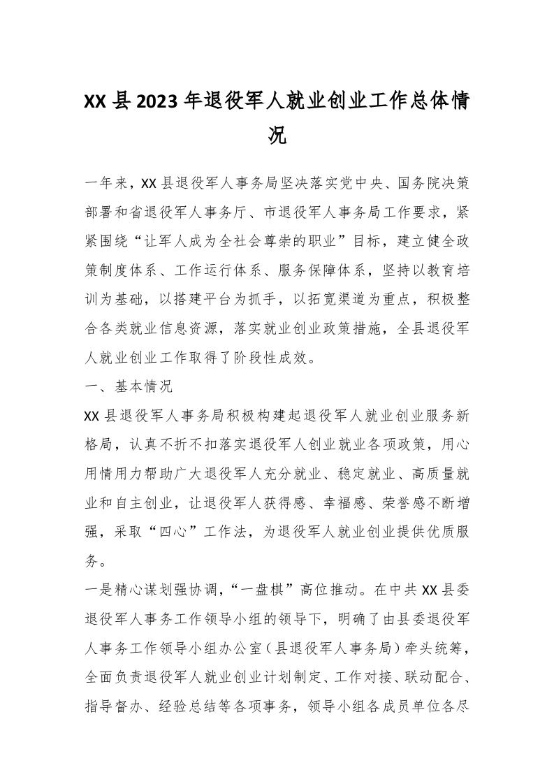 / XX县2023年退役军人就业创业工作总体情况