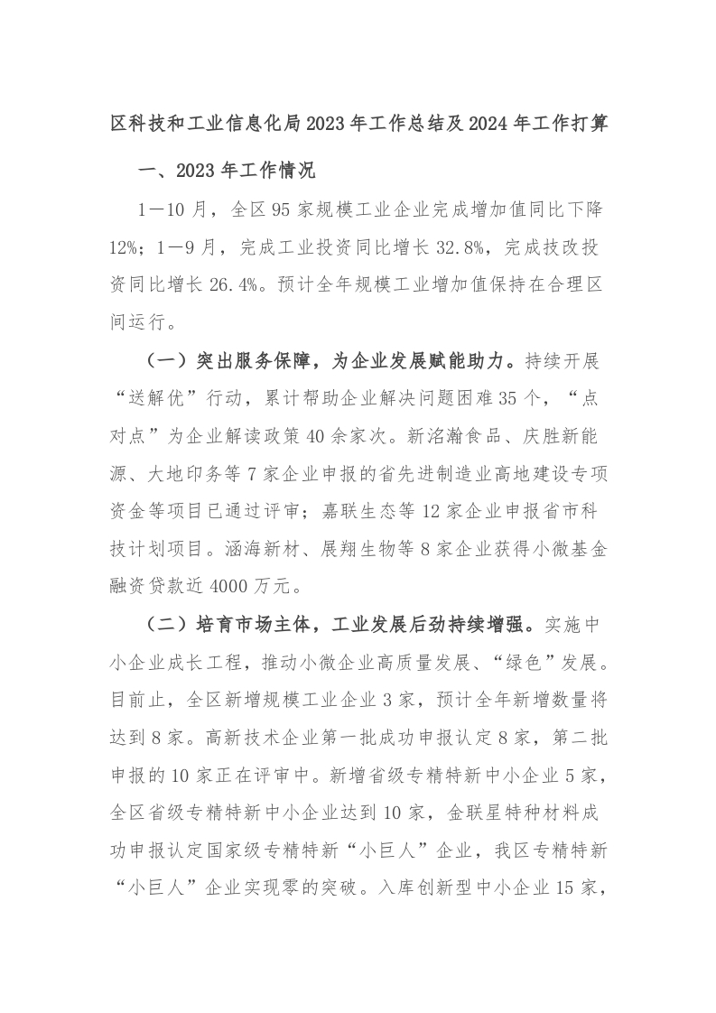 / 区科技和工业信息化局2023年工作总结及2024年工作打算