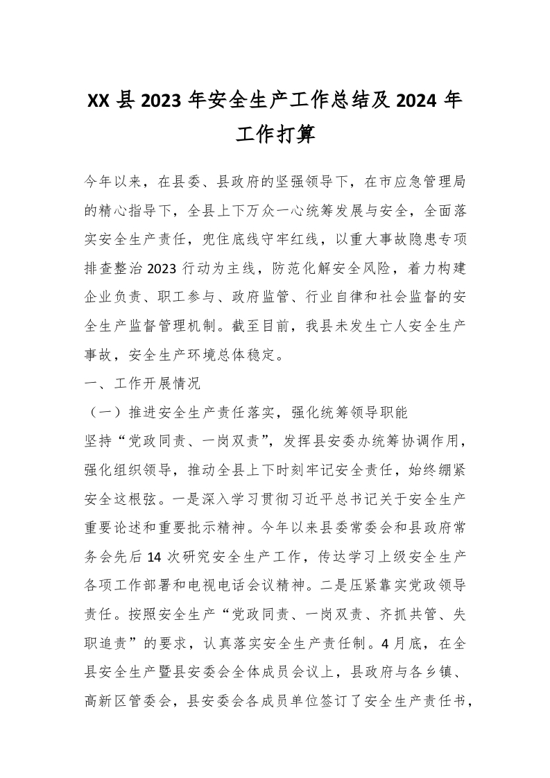 / XX县2023年安全生产工作总结及2024年工作打算