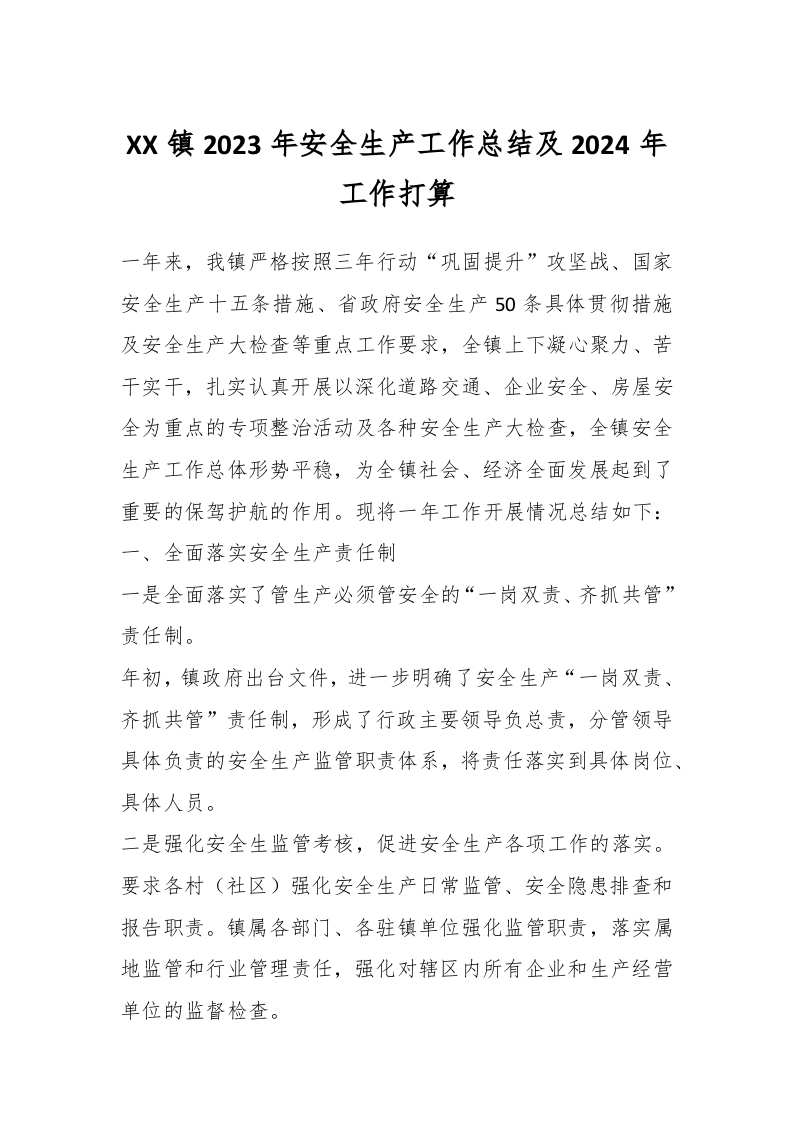 / XX镇2023年安全生产工作总结及2024年工作打算