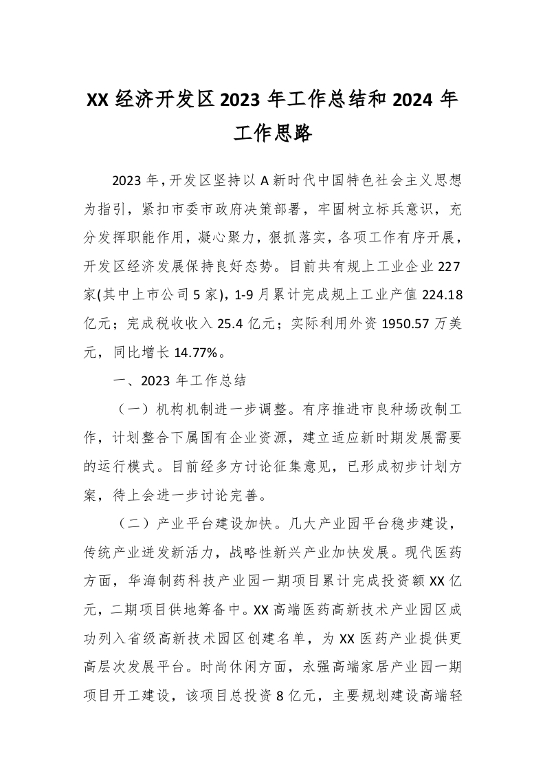 / XX经济开发区2023年工作总结和2024年工作思路