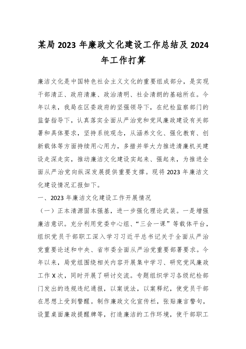 / 某局2023年廉政文化建设工作总结及2024年工作打算
