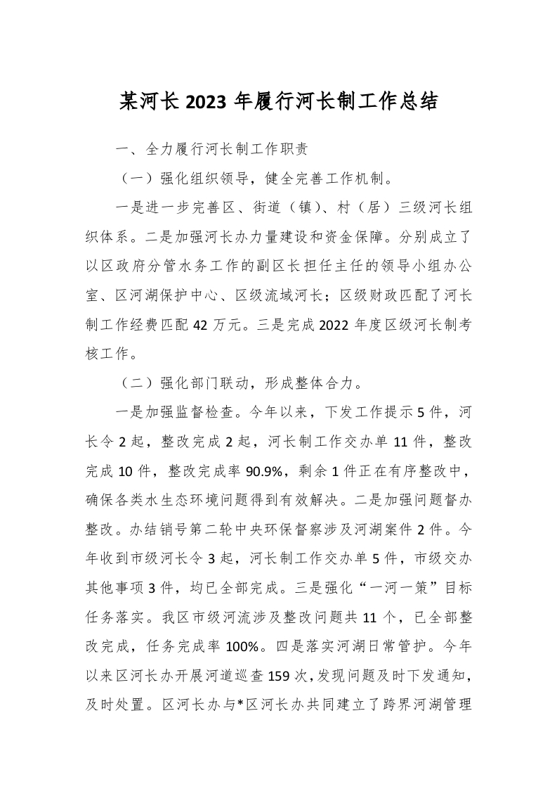 / 某河长2023年履行河长制工作总结