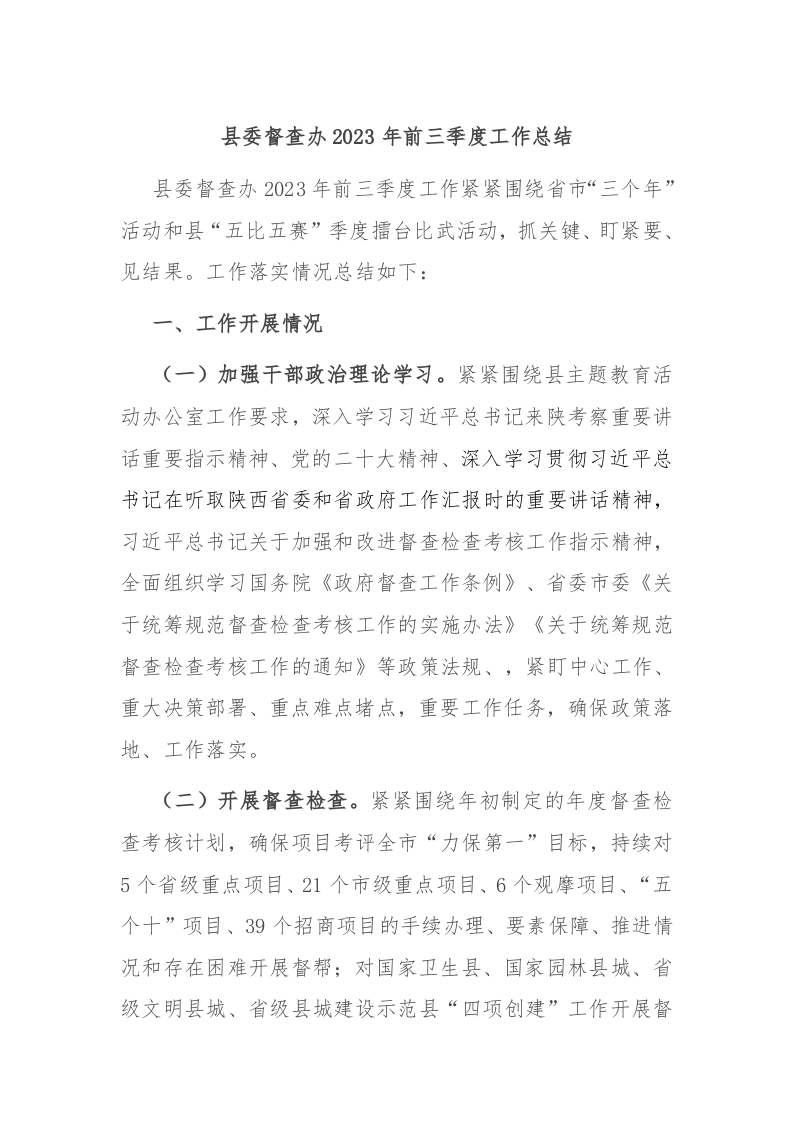 / 县委督查办2023年前三季度工作总结