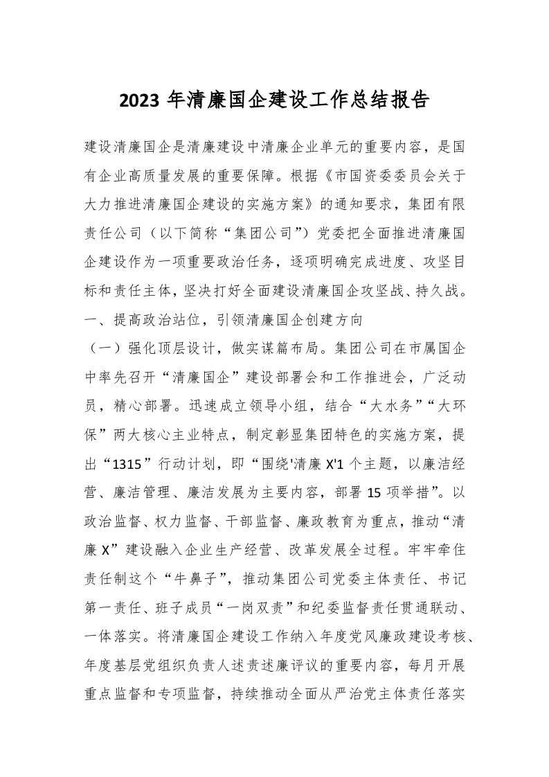 / 2023年清廉国企建设工作总结报告