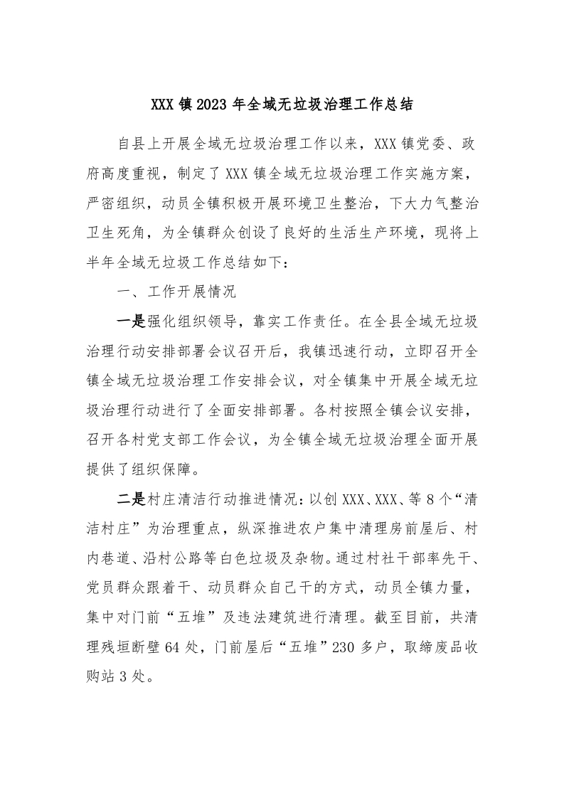 / XXX镇2023年全域无垃圾治理工作总结