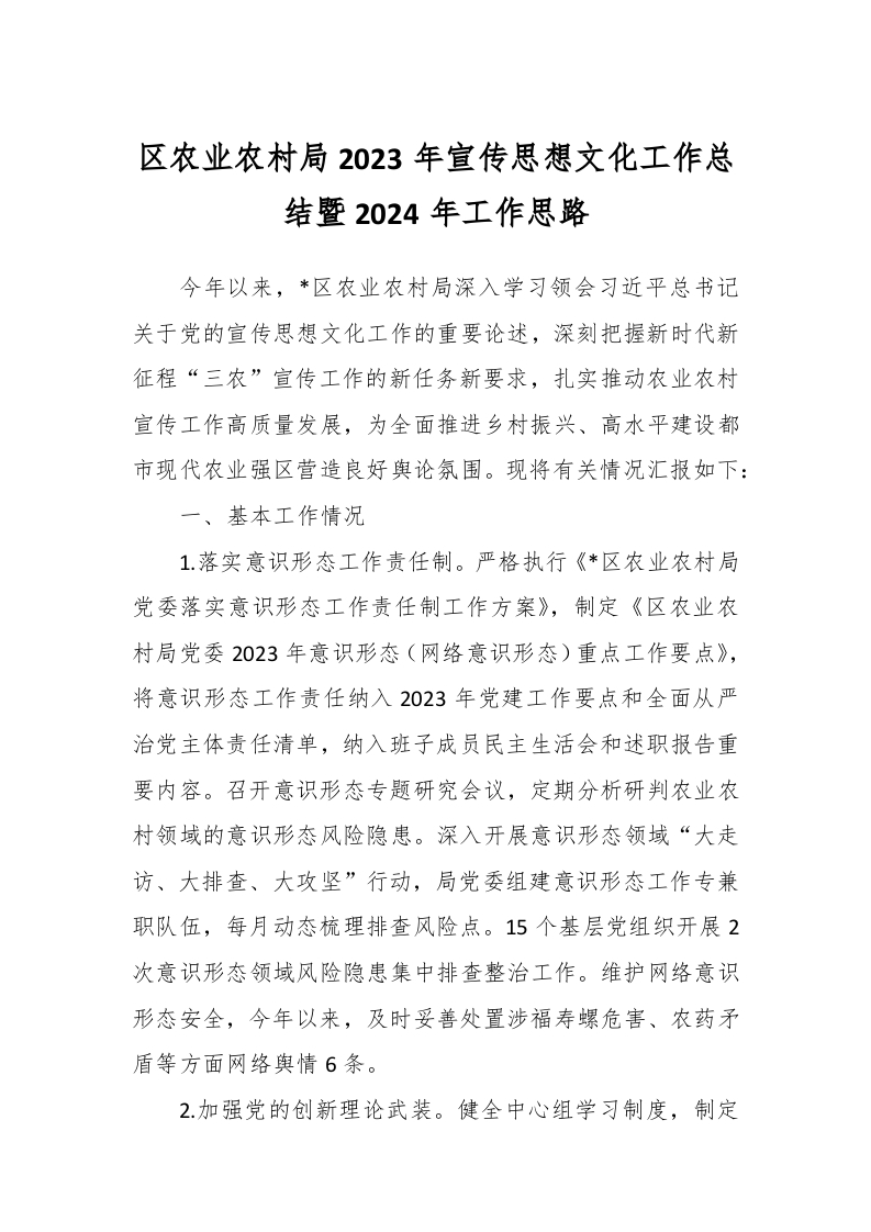 / 区农业农村局2023年宣传思想文化工作总结暨2024年工作思路