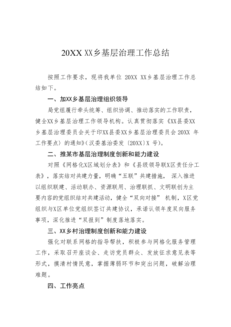 20XX 年城乡基层治理工作总结