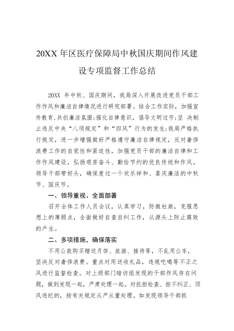 / 20XX年区医疗保障局中秋国庆期间作风建设专项监督工作总结