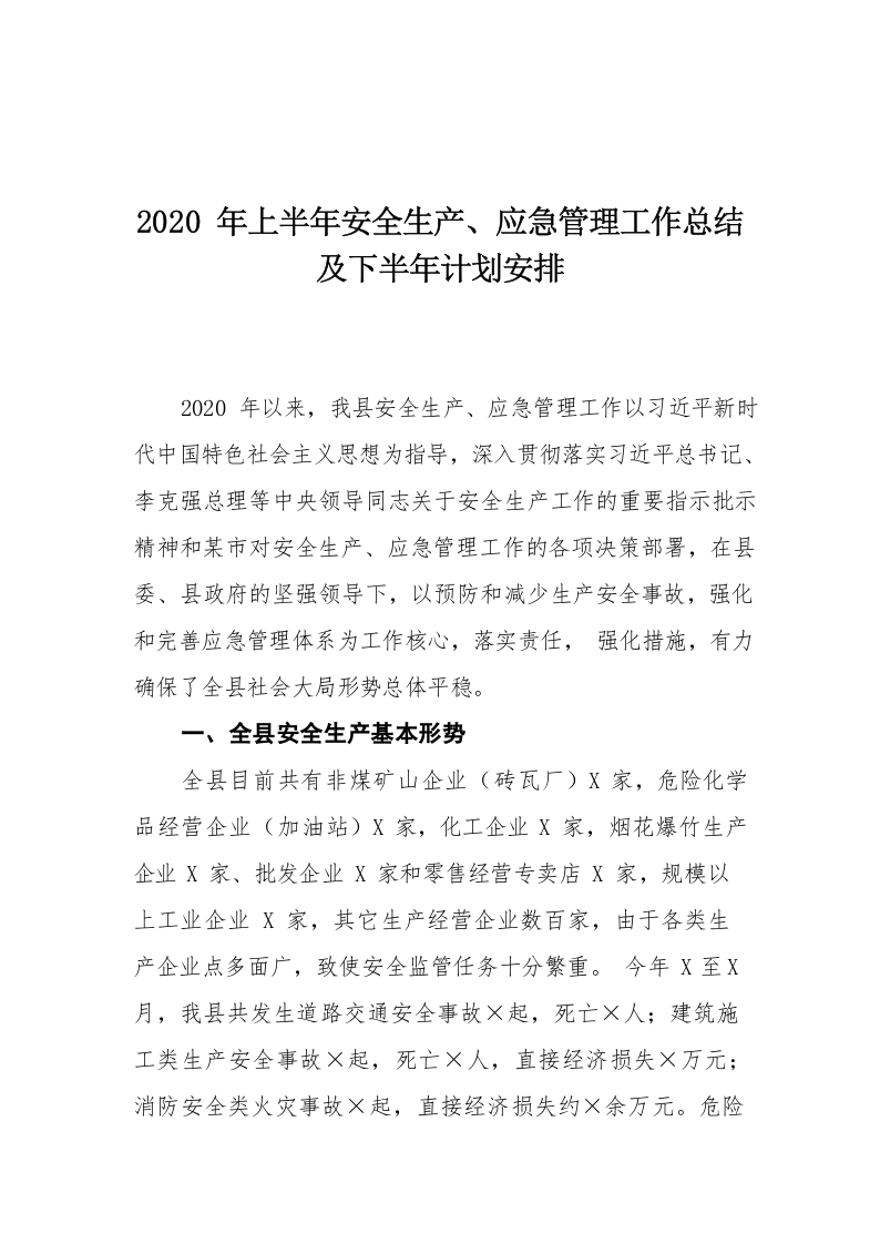 / 2020年上半年安全生产、应急管理工作总结及下半年计划安排