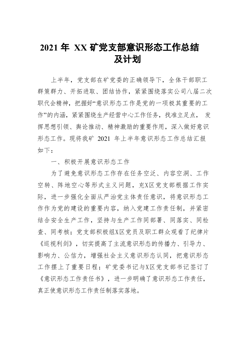 / 2021年XX矿党支部意识形态工作总结及计划