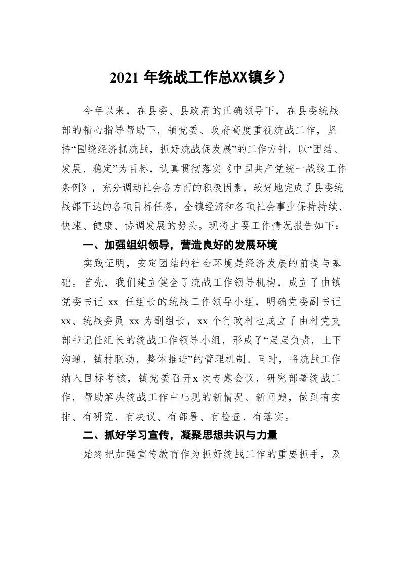 / 2021年统战工作总结(镇乡)