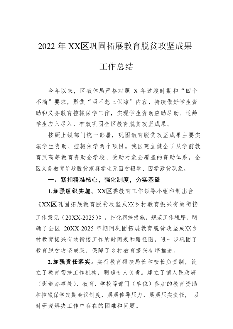 / 2022年XX区巩固拓展教育脱贫攻坚成果工作总结(20221127)