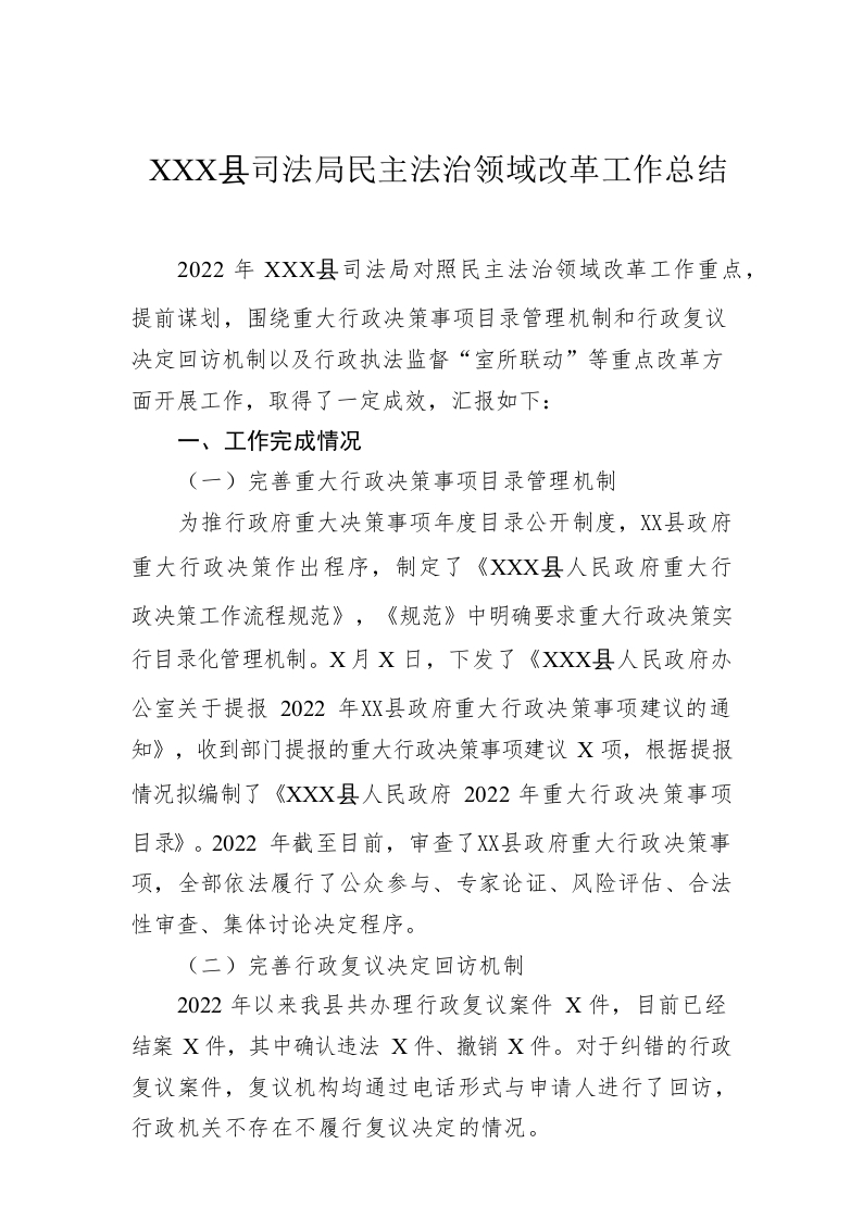 / 2022年XX县司法局民主法治领域改革工作总结