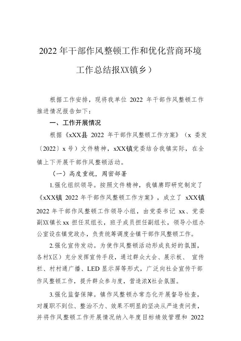 / 2022年干部作风整顿工作和优化营商环境工作总结报告(镇乡)