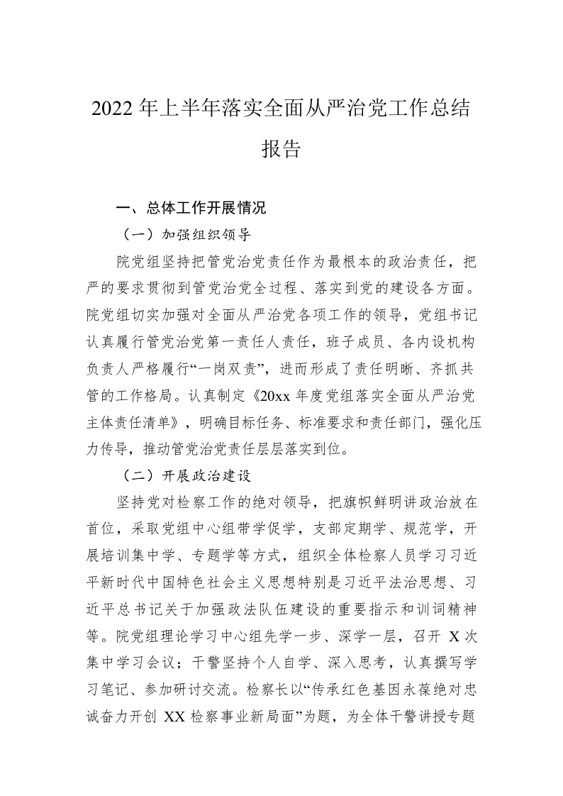 / 2022年上半年落实全面从严治党工作总结报告