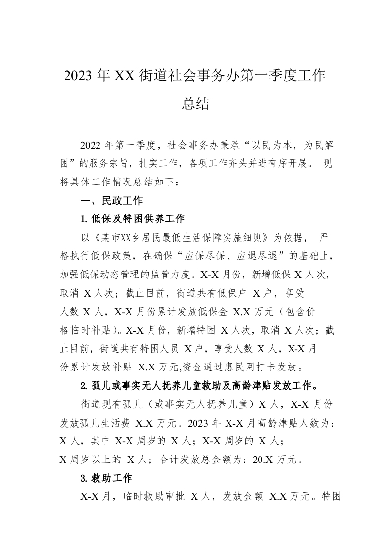 / 2023年XX街道社会事务办第一季度工作总结(20230423)