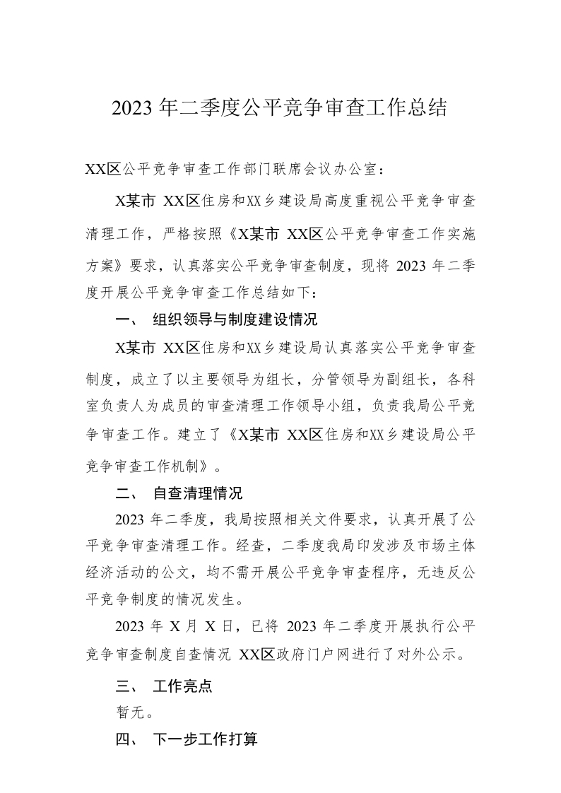 / 2023年二季度公平竞争审查工作总结(20230609)