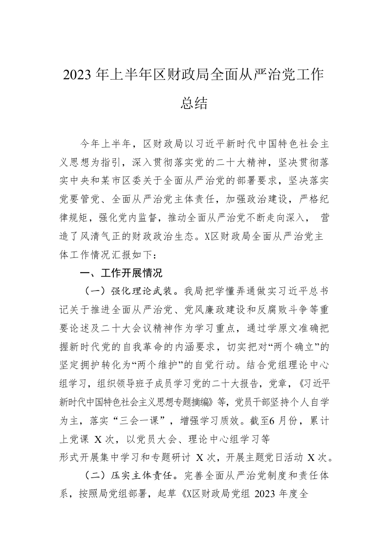 / 2023年上半年区财政局全面从严治党工作总结(20230625)