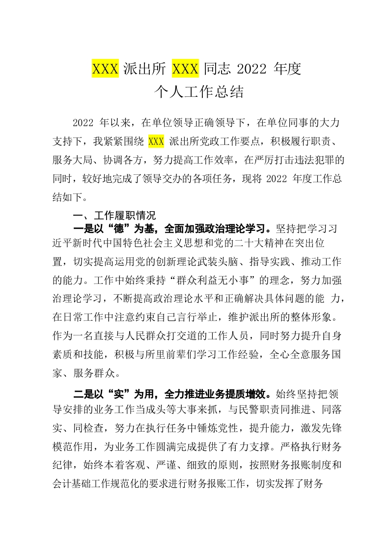 / XXX派出所XXX同志2022年度个人工作总结