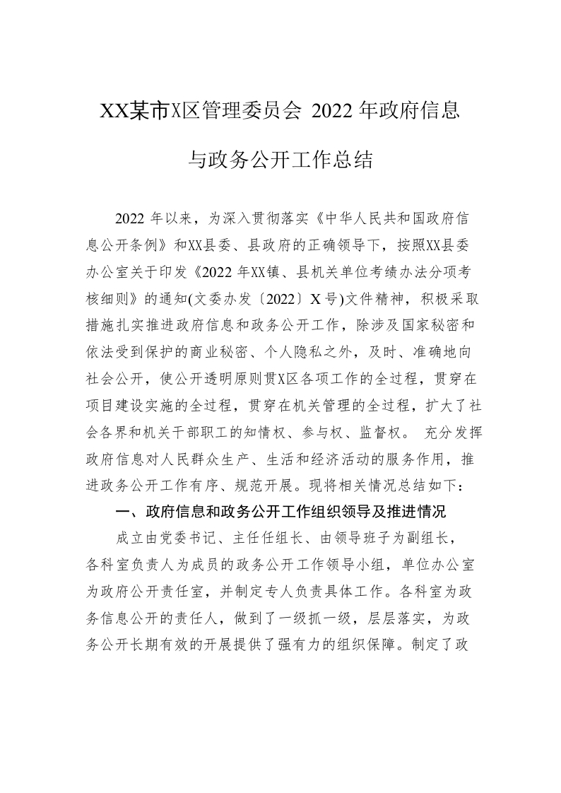 / XX城市新区管理委员会2022年政府信息与政务公开工作总结(20221221)