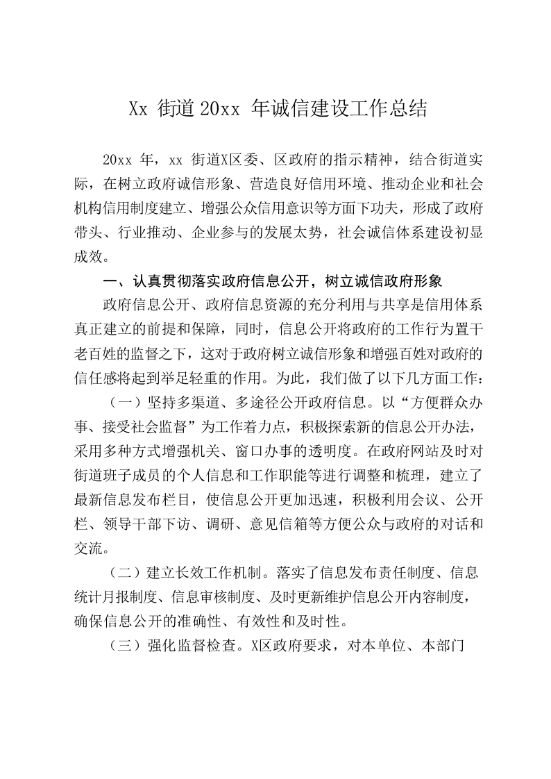 / XX街道20xx年诚信建设工作总结