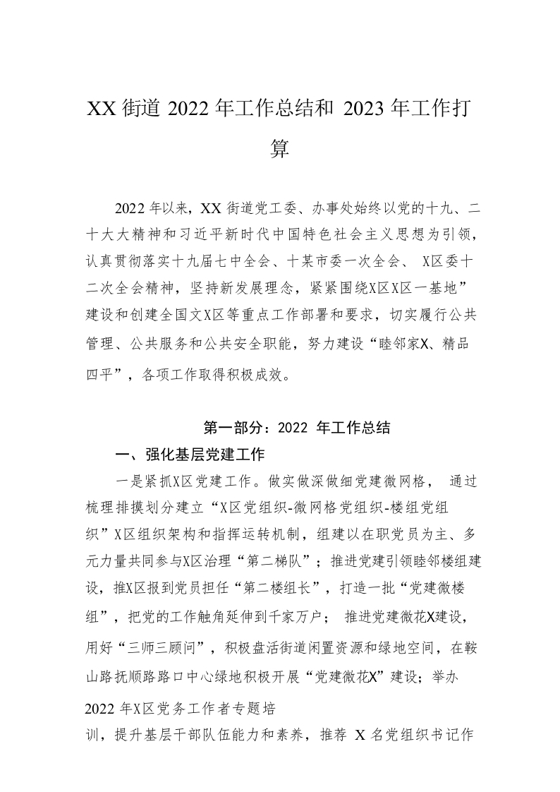 XX街道2022年工作总结和2023年工作安排