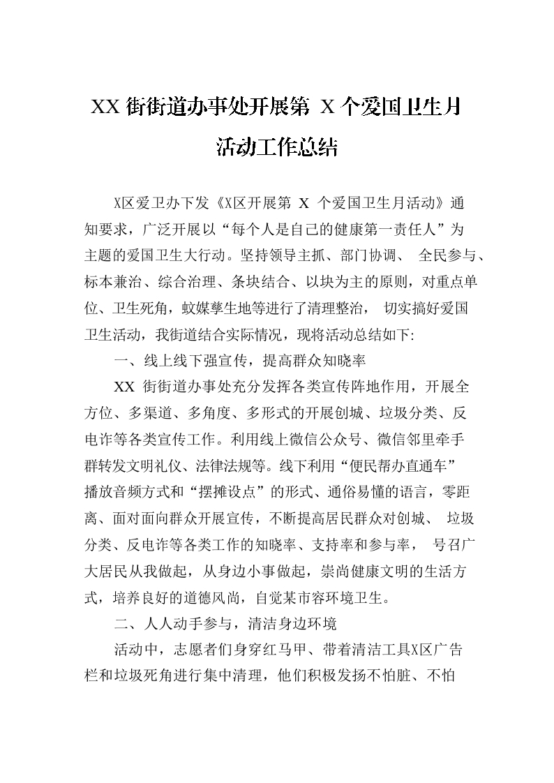 / XX街街道办事处开展第35个爱国卫生月活动工作总结(20230504)