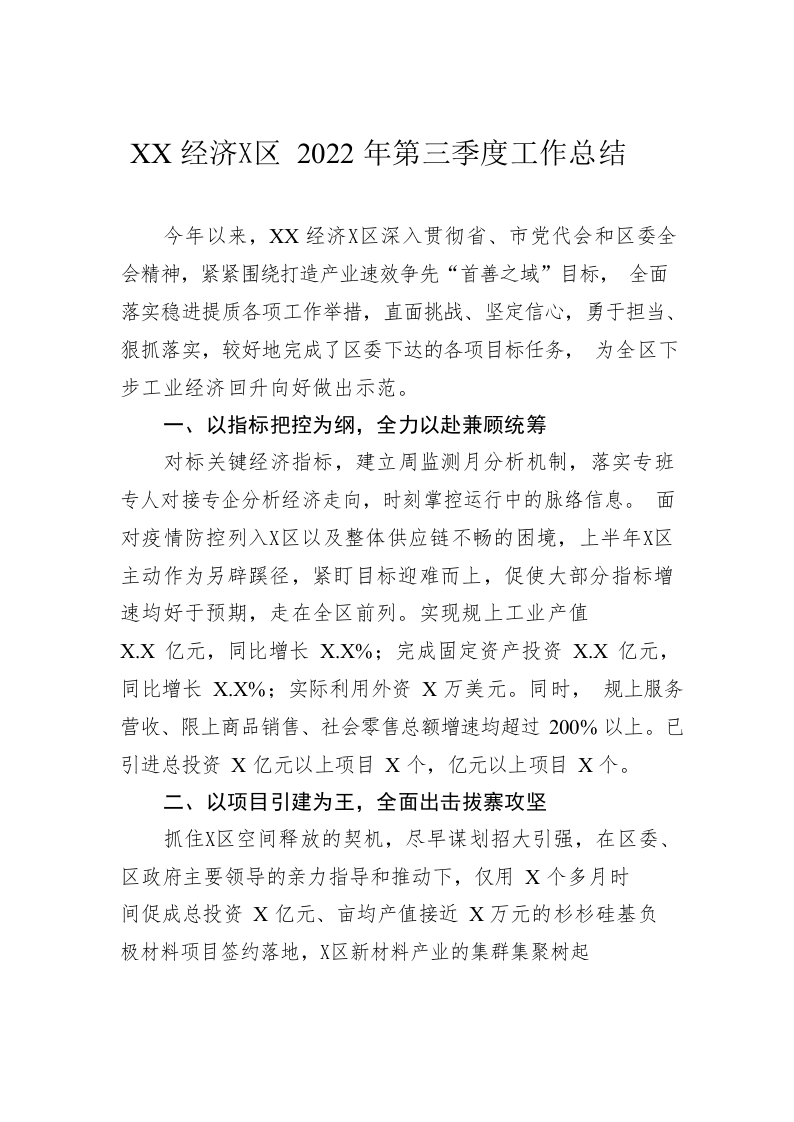 / XX经济开发区2022年第三季度工作总结(20221110)