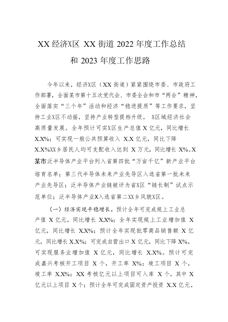 / XX经济开发区XX街道2022年度工作总结和2023年度工作思路
