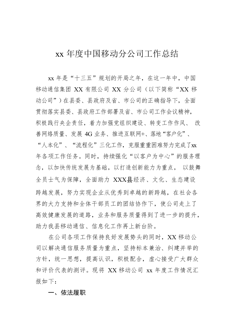 xx年度中国移动分公司工作总结
