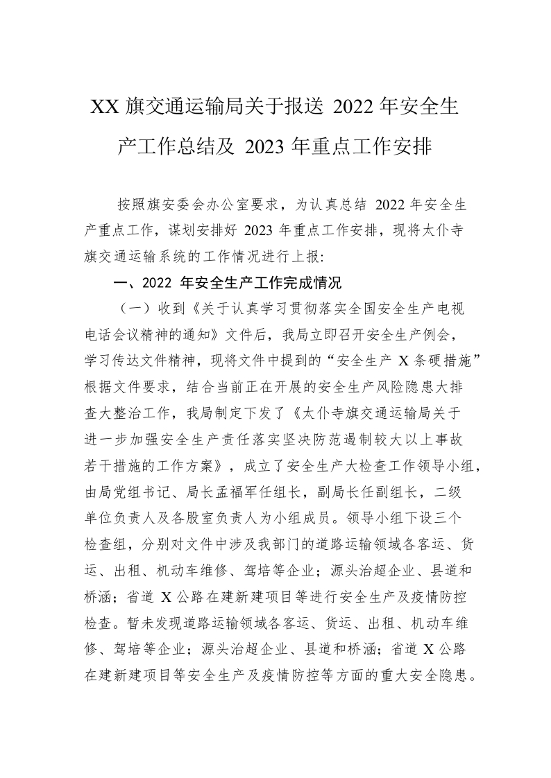 / XX旗交通运输局关于报送2022年安全生产工作总结及2023年重点工作安排(20221130)