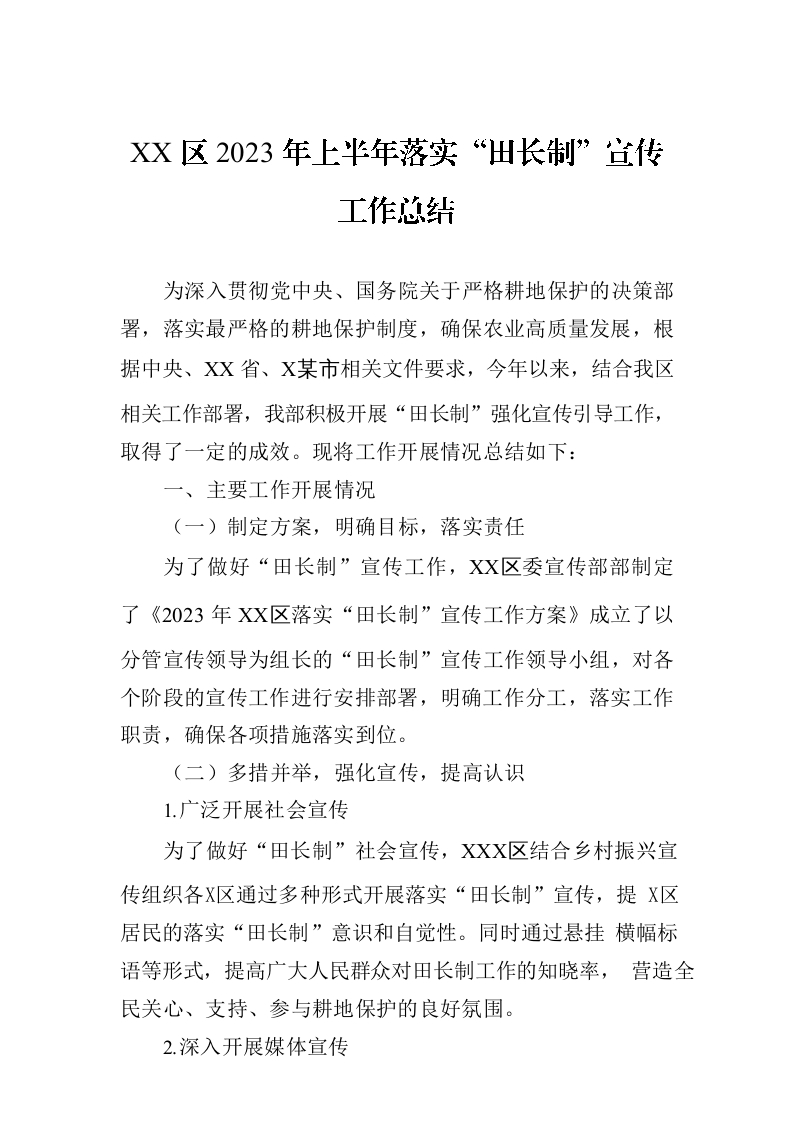 / XX区2023年上半年落实“田长制”宣传工作总结