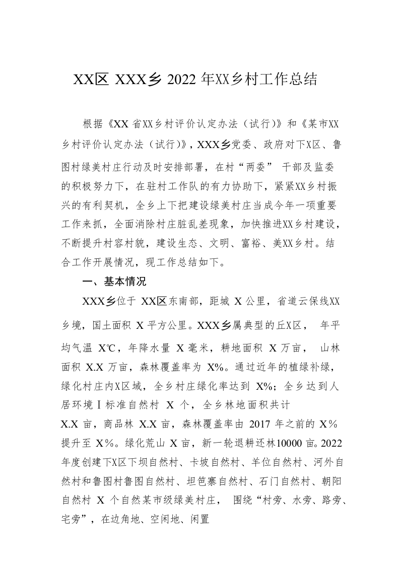 / XX区XX乡2022年绿美乡村工作总结(20221222)