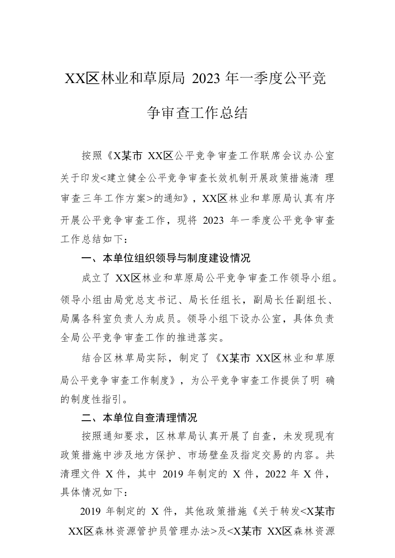 / XX区林业和草原局2023年一季度公平竞争审查工作总结