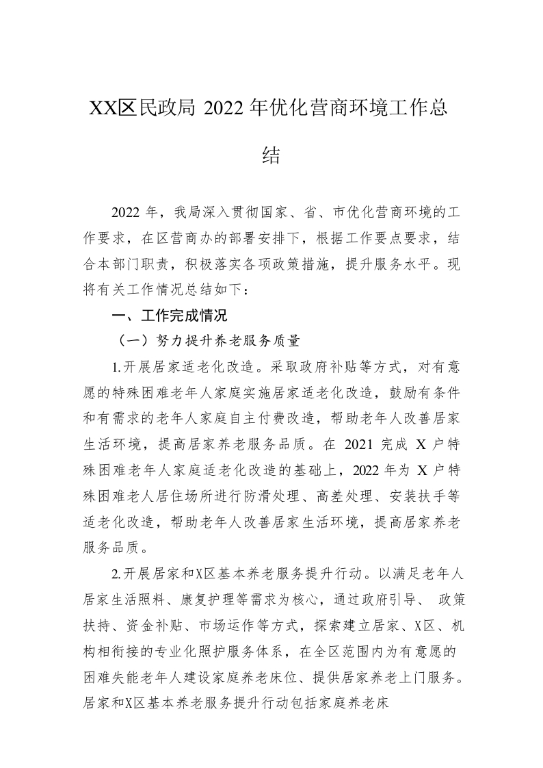 / XX区民政局2022年优化营商环境工作总结