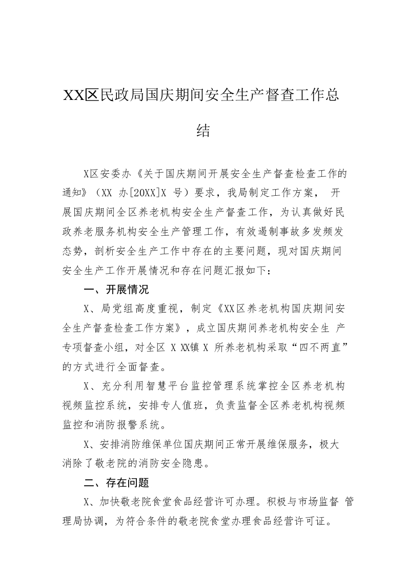 / XX区民政局国庆期间安全生产督查工作总结