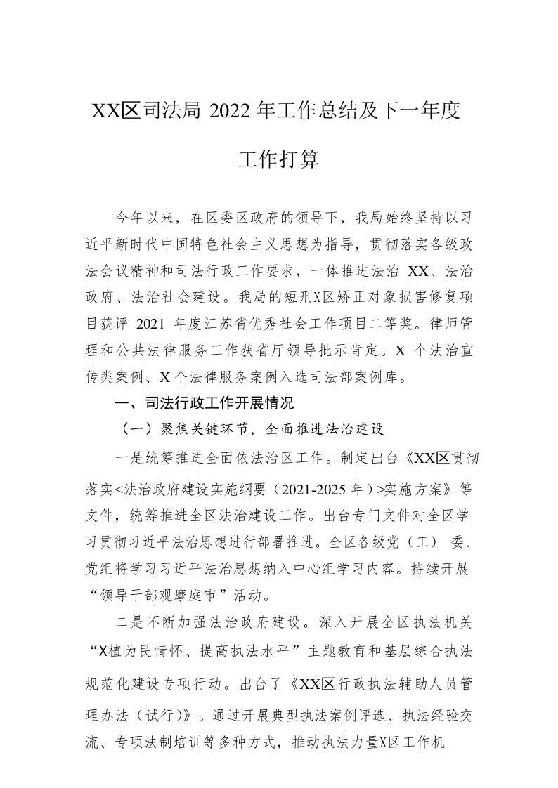 / XX区司法局2022年工作总结及下一年度工作打算(20230105)