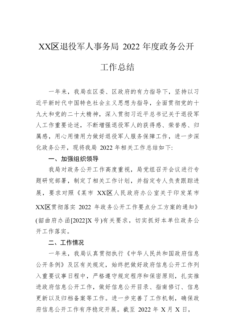 / XX区退役军人事务局2022年度政务公开工作总结(20221121)
