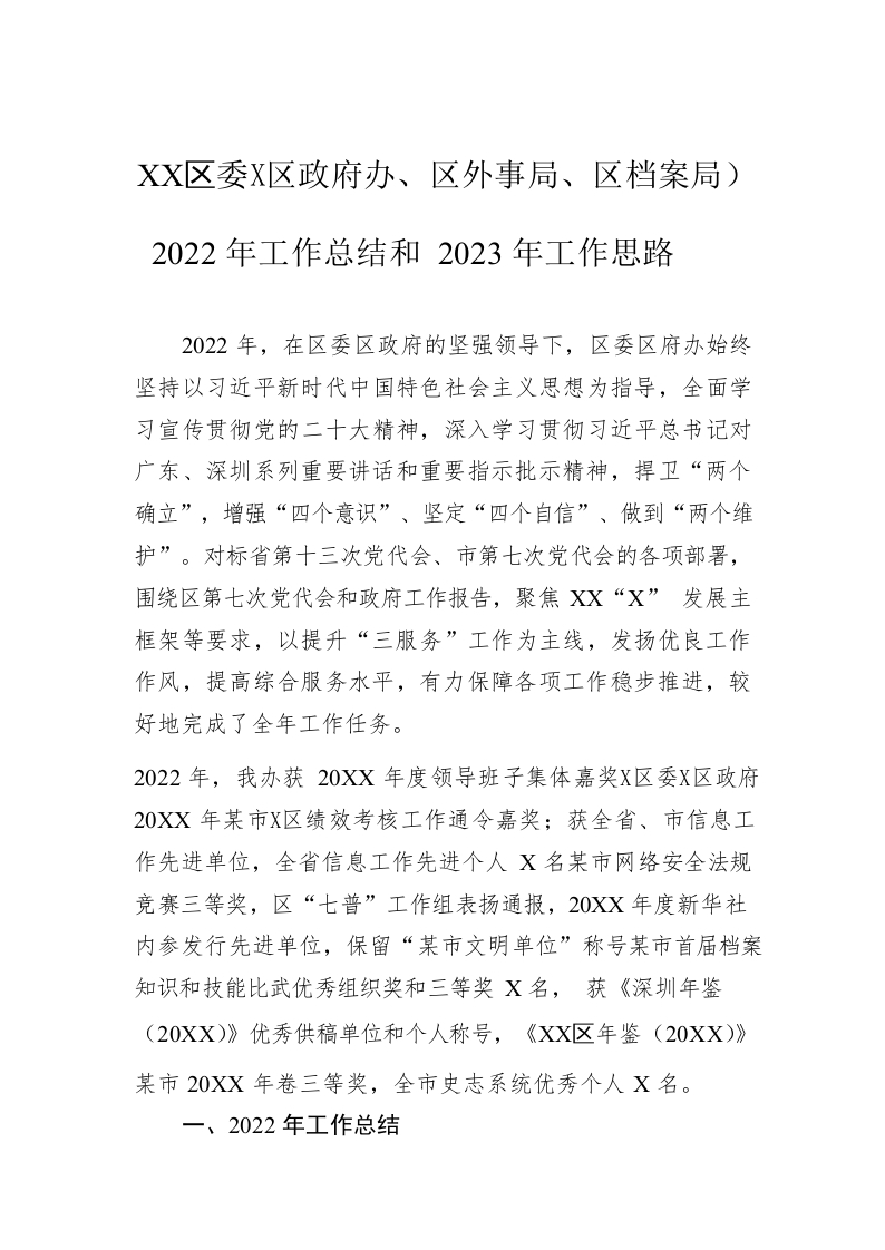 / XX区委办(区政府办、区外事局、区档案局)2022年工作总结和2023年工作思路(20221222)