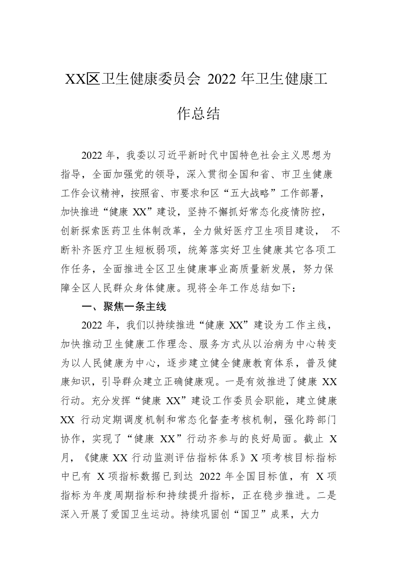 / XX区卫生健康委员会2022年卫生健康工作总结