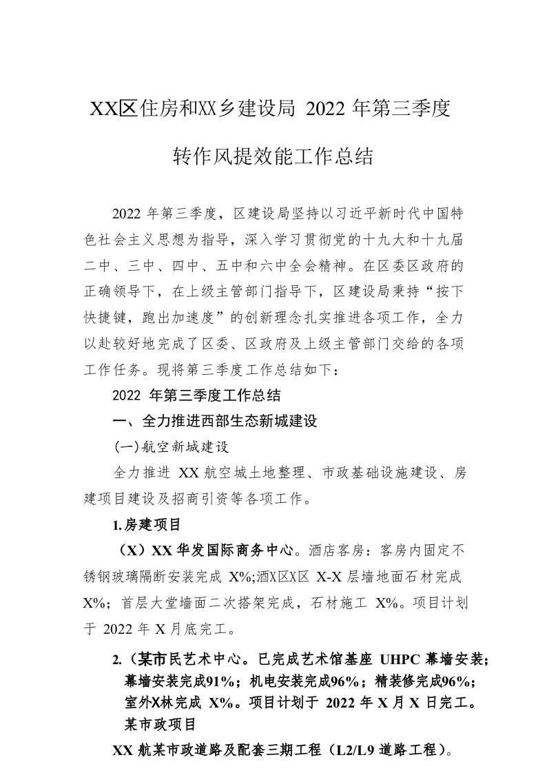 / XX区住房和城乡建设局2022年第三季度转作风提效能工作总结(20221019)