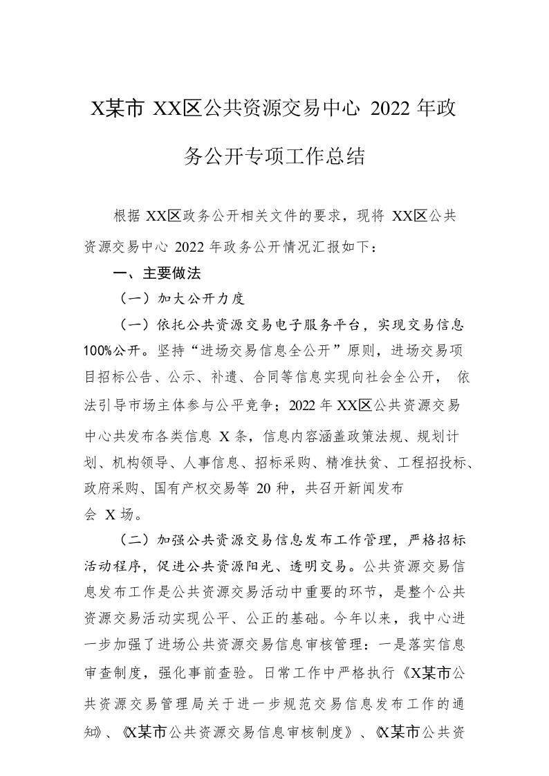 / XX市XX区公共资源交易中心2022年政务公开专项工作总结(20221130)
