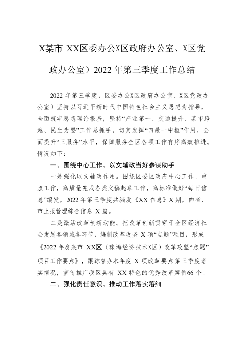 / XX市XX区委办公室(区政府办公室、开发区党政办公室)2022年第三季度工作总结(20221024)