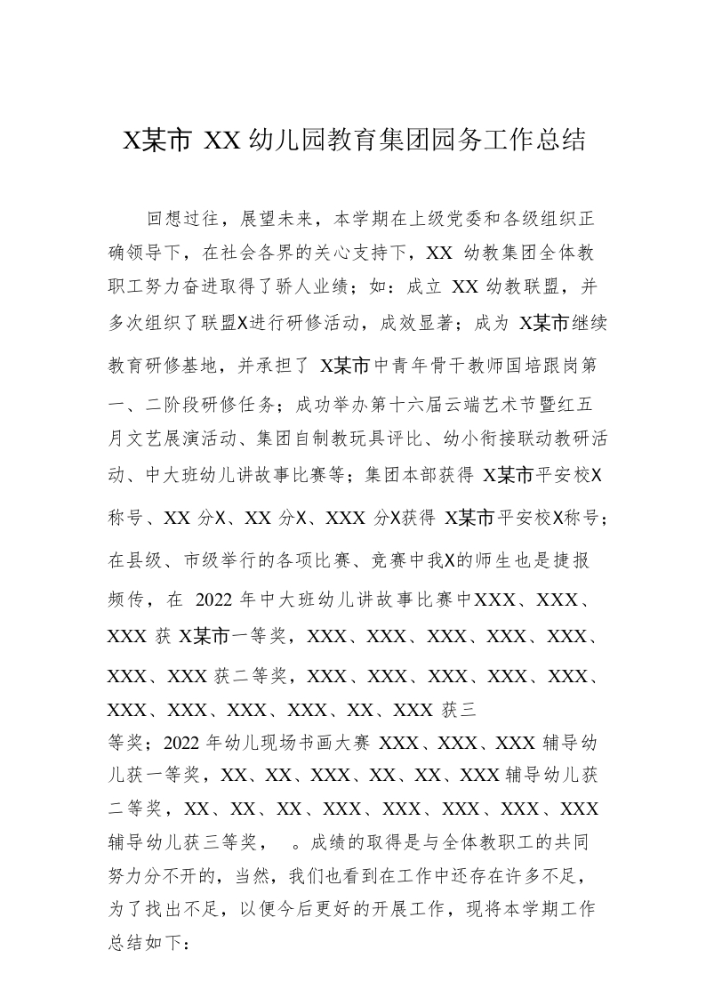 / XX市XX幼儿园教育集团园务工作总结