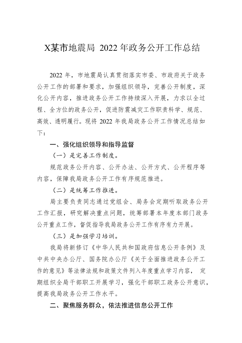 / XX市地震局2022年政务公开工作总结(20221220)