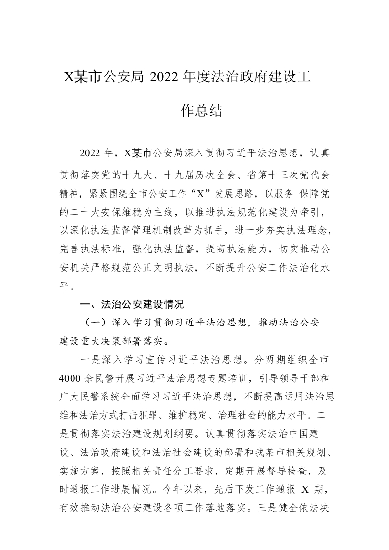 / XX市公安局2022年度法治政府建设工作总结(20230104)