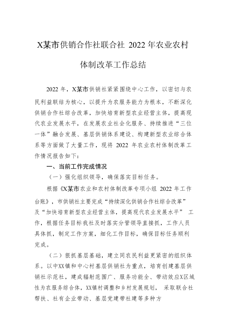 / XX市供销合作社联合社2022年农业农村体制改革工作总结