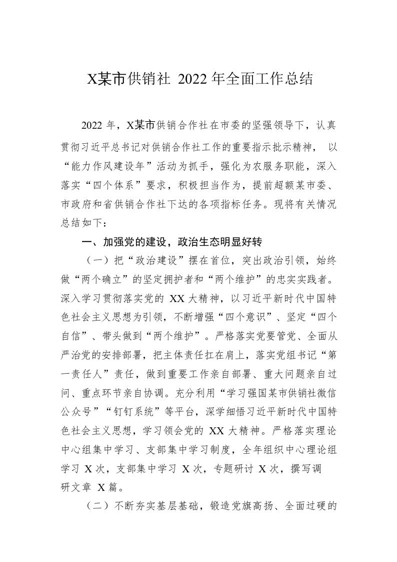 XX市供销合作社联合社2022年农业农村体制改革工作总结