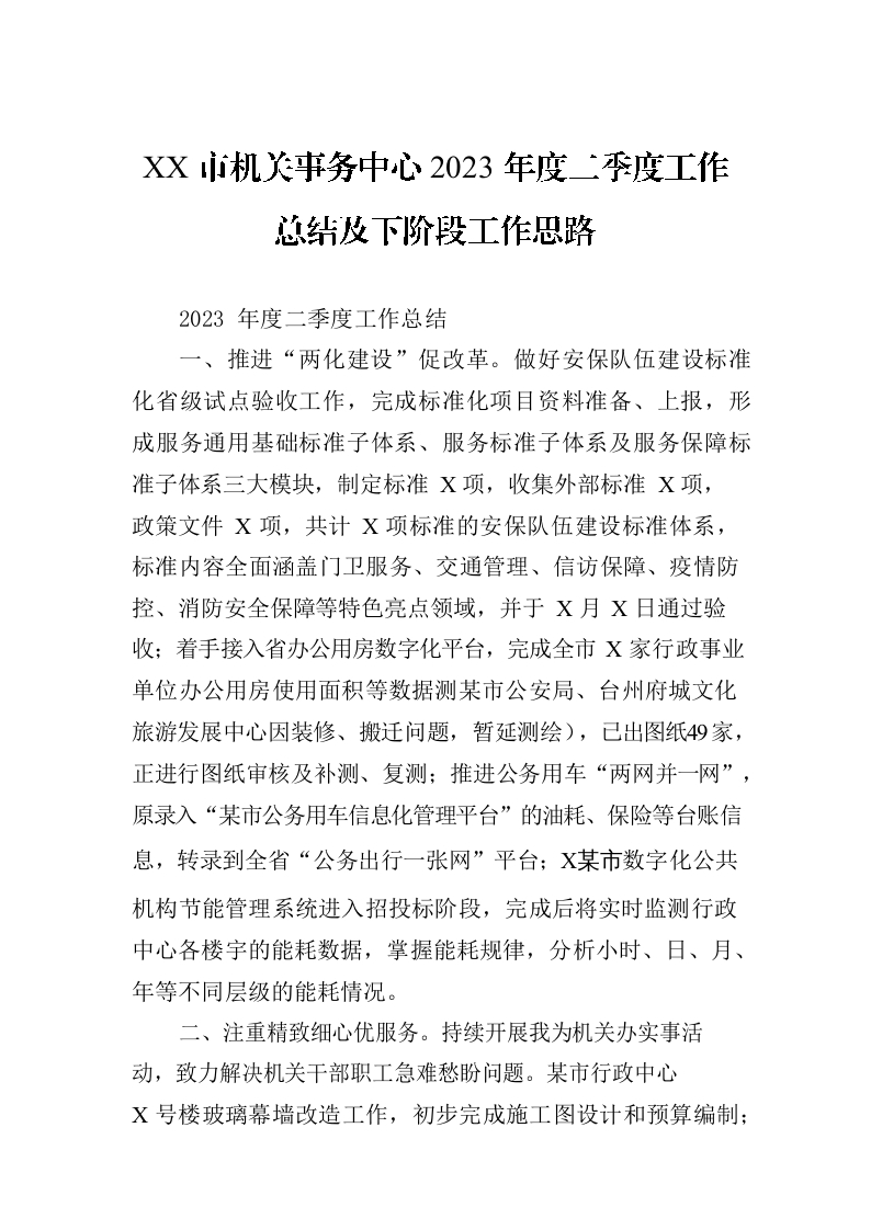 / XX市机关事务中心2023年度二季度工作总结及下阶段工作思路(20230801)